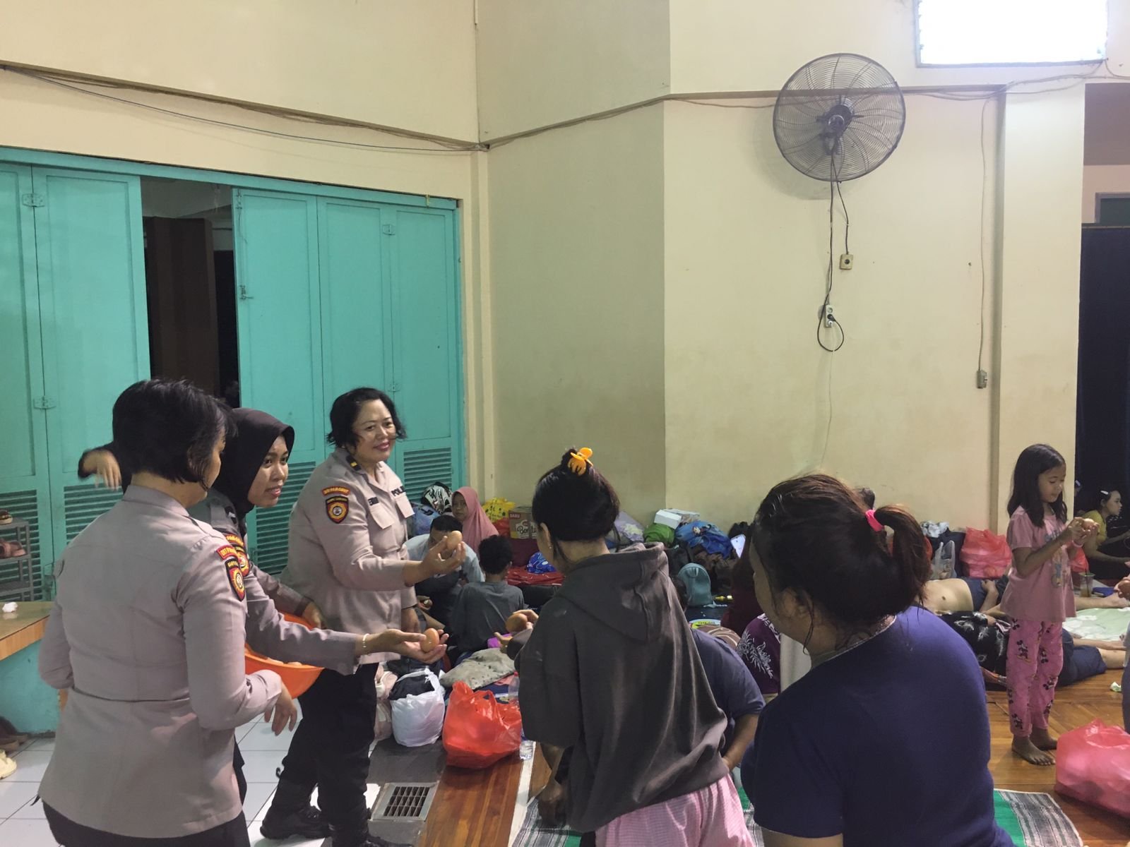 Di sana, puluhan personel polisi membagikan makanan untuk ratusan warga yang berada di tempat pengungsian. Mereka berkoordinasi dengan camat dan lurah hingga RT/RW setempat.